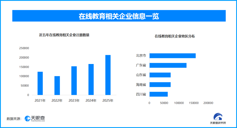天眼查专业版数据显示,截至目前我国现存在业、存续状态的在线教育相关企业超118万家。其中,2025年新增注册相关企业约21.4万家,从企业注册数量趋势来看,近五年间,除2022年外,在线教育相关企业的注册数量呈现出逐年增长的态势,并在2025年达到顶峰。