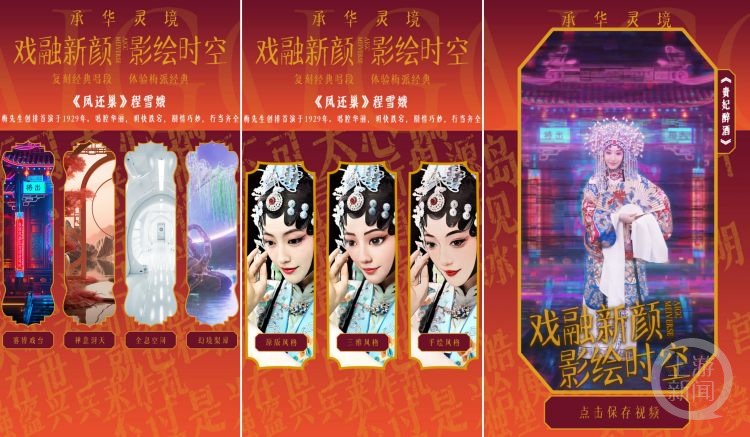 上游新闻记者尝试后发现,梅兰芳经典剧目中的上元夫人、白娘子、杨贵妃、虞姬、西施、穆桂英、花木兰、织女等角色均可选择,大家登上的舞台背景也有“赛博戏台”“禅意洞天”“全息空间”“幻境梨园”任选。随后生成的你变身演绎“独家”京剧唱段的视频,可以保存到手机上,方便大家随时回看。