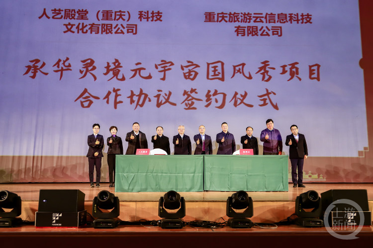 此外,在现场,主办方人艺殿堂(重庆)科技文化有限公司还与重庆旅游云信息科技有限公司正式签署了合作协议。双方将就“元宇宙XR+AI+IP”赋能新文旅创新融合展开深度战略合作,共同推动元宇宙文旅项目在重庆落地,同“AR秒变名角:戏融新颜 影绘时空”相仿的玩法将有望在更多的重庆文旅地标同广大市民、游客见面。