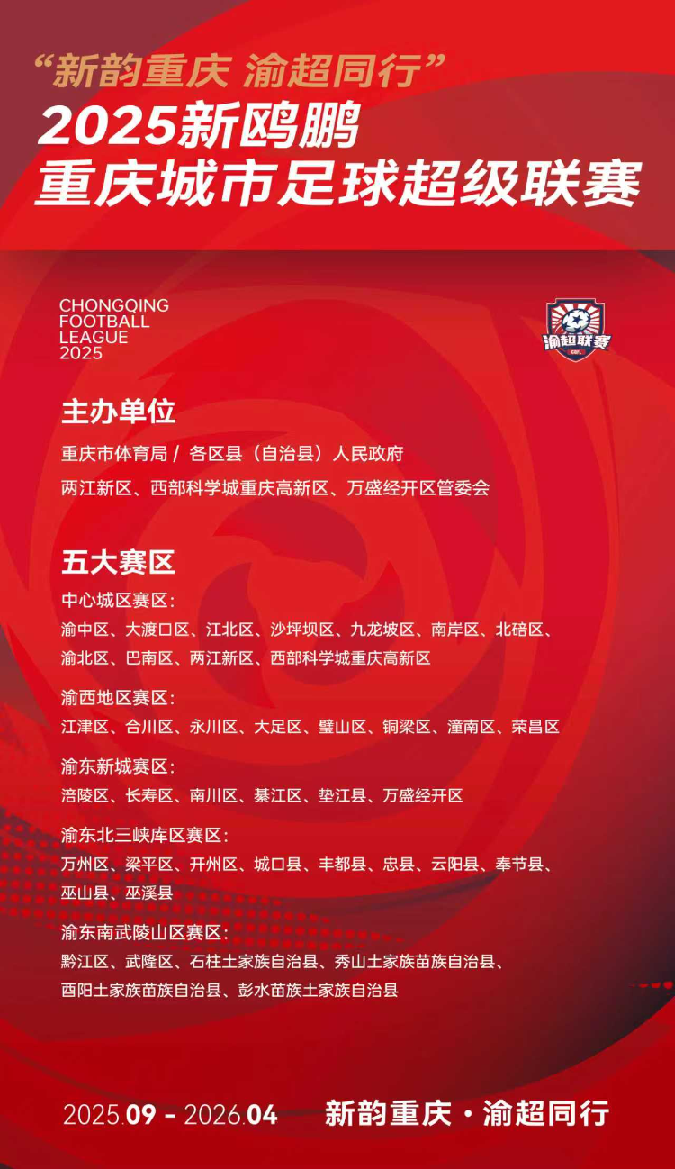 上游新闻记者从重庆市体育局获悉,“新韵重庆渝超同行”2025新鸥鹏重庆城市足球超级联赛将于9月13日正式拉开帷幕。赛事提档升级再出发,全市所有区县大联动,重庆球迷期盼已久的“渝超”来了!