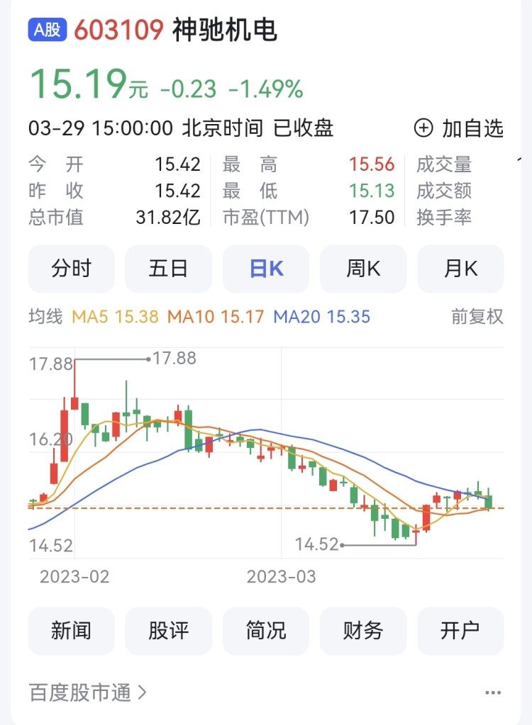 3月29日,神驰机电报收15.19元,跌1.49%,换手率0.71%,总市值31.82亿元。