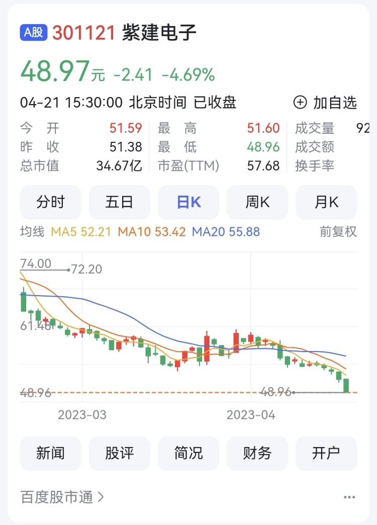 4月21日,紫建电子报收48.97元,跌4.69%,今年以来股价累计下跌5.00%,同期上证指数上涨6.86%。