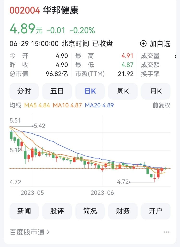 6月29日,华邦健康报收4.89元,跌0.20%,换手率0.33%,滚动市盈率21.92,总市值96.82亿元。