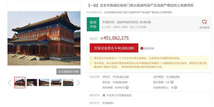 上游新闻记者还获悉,今年4月25日至4月26日,福建省厦门市湖里区人民法院将在京东网司法拍卖平台上,对北京市西城区地安门西大街28号房产及该房产相应的土地使用权进行公开整体拍卖,起拍价4.51062275亿元,较评估价5.30661500亿元打了8.5折。
