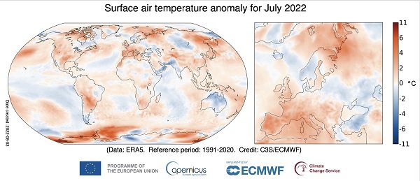 图说:2022年7月,全球地表气温异常