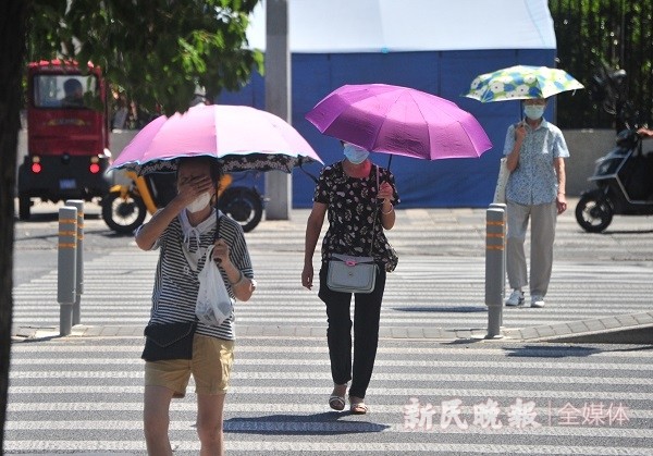 图说:街头过马路的路人纷纷撑着遮阳伞抵御烈日炙烤 杨建正 摄