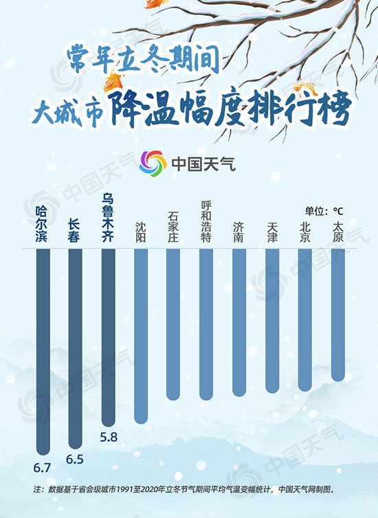 在这个降温最猛的节气里,东北、华北地区的城市气温最容易暴跌。中国天气网通过盘点1991年至2020年省会级城市立冬节气期间平均气温变幅发现,降温排行榜前十全部位于北方,其中哈尔滨位居榜首,降温幅度达6.7℃;长春和乌鲁木齐以6.5℃和5.8℃位列二三位。