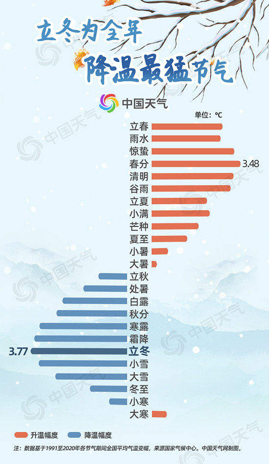 所谓“立冬一日,水冷三分”,立冬也是全年降温最猛的节气,尤其是北方已进入“以风鸣冬”的寒冷时节。从中国天气网二十四节气全国平均气温变幅来看,立秋开始,全国平均气温开始下跌,立冬为降幅峰值,达3.77℃,其次是霜降节气、小雪节气,降幅分别为3.62℃和3.46℃。