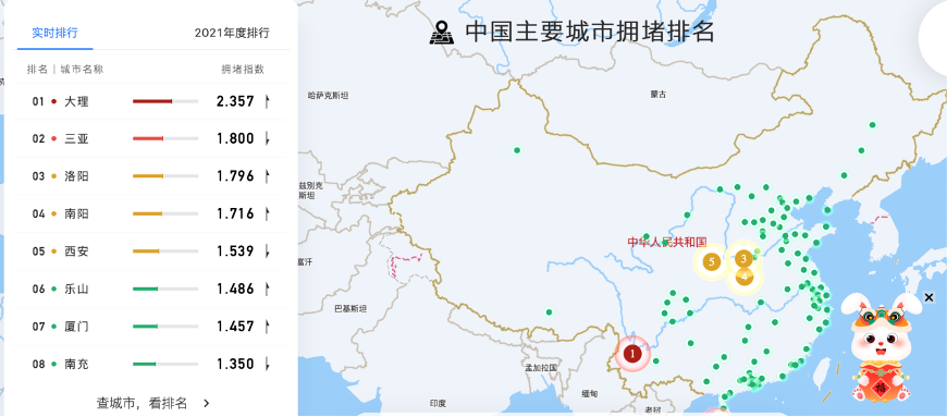人民日报健康客户端消息,1月22日晚,人民日报健康客户端记者梳理百度出行大数据发现,在交通出行实时数据方面,当前拥堵城市排名第一名为云南大理、第二名为海南三亚、第三名为河南洛阳,之后为河南南阳、陕西西安,除此之外,排在前10位的均为旅游城市。