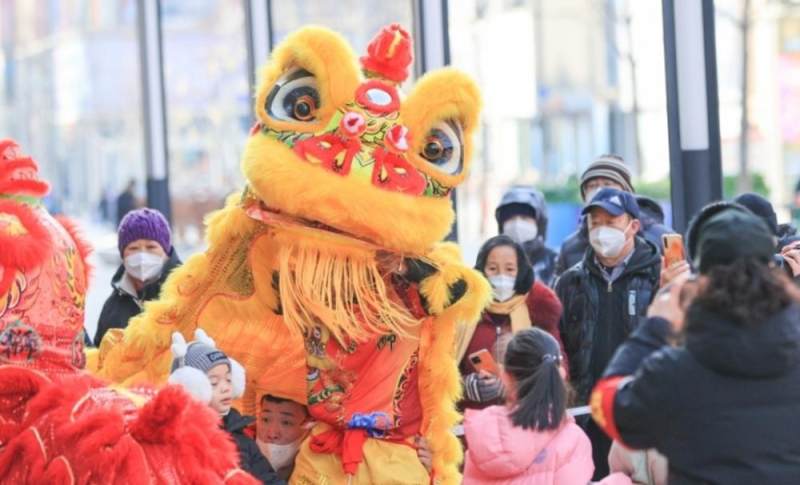 1月22日,大年初一,北京王府井步行街上,上演开年舞狮表演,迎接农历新年开市。中新社记者贾天勇摄