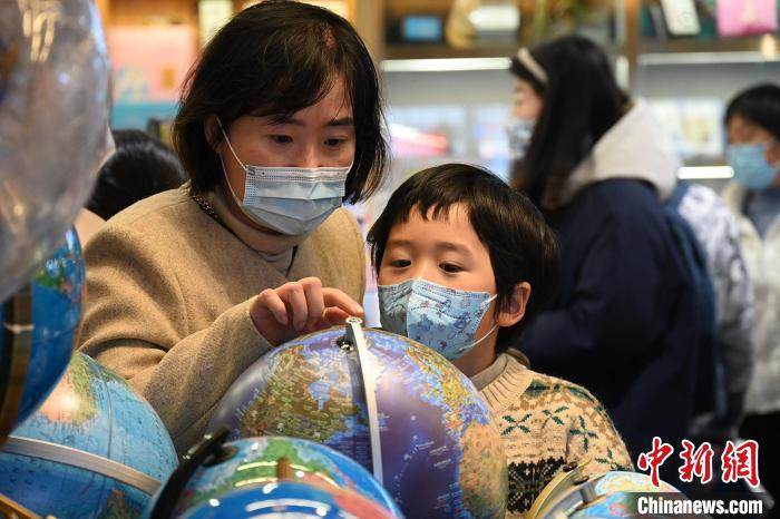 安徽合肥,中小学开学前夕,家长和学生在选择地球仪。杨晓原 摄