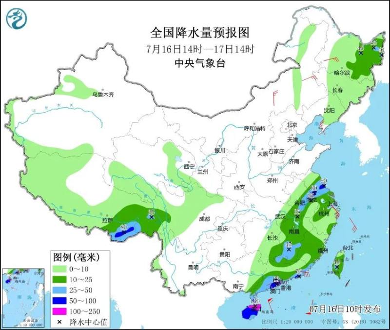 降水预报:7月16日14时至17日14时,广东南部和北部、海南岛、福建东南部、江西中部和南部、台湾岛南部等地的部分地区有中到大雨,其中海南岛、雷州半岛南部、广东南部沿海等地局地有暴雨或大暴雨(100至160毫米)。