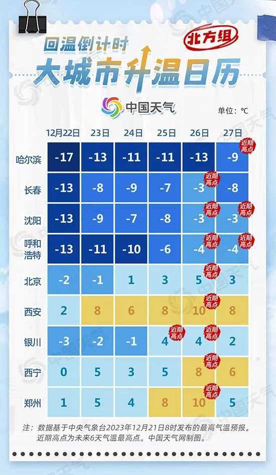 从大城市升温日历可以看到,12月22日,北方大部率先升温,大城市中,西安、郑州最高气温将重回冰点以上。到了本周末,西安最高气温或达8℃,北京最高气温也可能升至0℃以上,长春升至-7℃左右,基本回到与常年同期持平的状态。下周初,各地气温将纷纷升至近期高点,26日,西安、郑州最高气温或达10℃,北京最高气温将有5℃,长春、呼和浩特回升至-3℃左右;哈尔滨27日最高气温也将达到-9℃,较常年同期偏高。