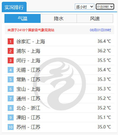 今晨,绍兴、扬州、无锡、常州、苏州、南京、上海、南通、杭州最低气温都在30℃以上,江苏六合(32.1℃)和姜堰(31.9℃)打破当地观测史夜温纪录。上午9时,多地高温已早早上线,上海徐家汇以36.4℃领跑气温榜,上海浦东、闵行、宝山,浙江北仑,江苏无锡、常州、通州、溧阳、苏州也出现高温。