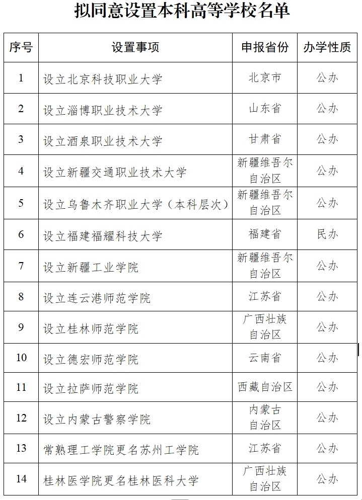 根据《中华人民共和国高等教育法》《普通高等学校设置暂行条例》《普通本科学校设置暂行规定》《本科层次职业学校设置标准(试行)》等有关规定以及第八届全国高等学校设置评议委员会考察评议结果,经教育部党组会议审议,拟同意设置北京科技职业大学等14所学校,现予公示。