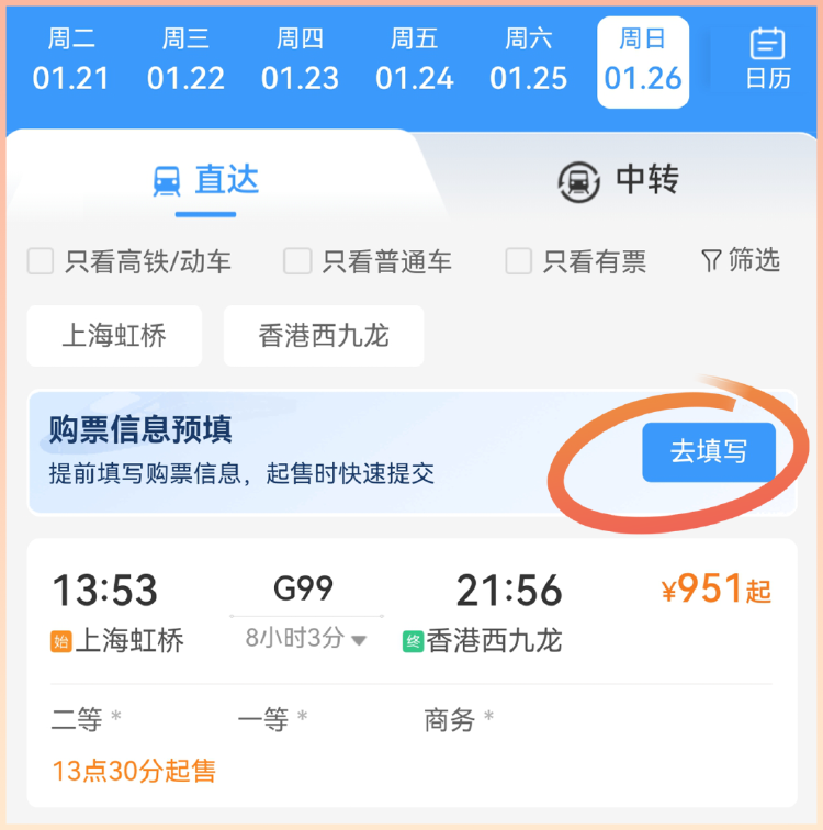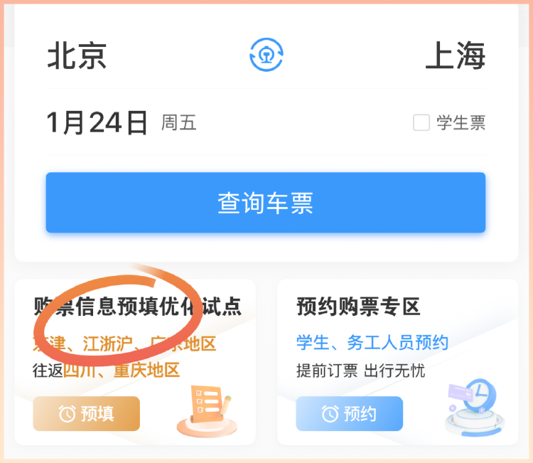 在车票起售前,可以先查看自己是否属于购票信息预填优化试点范围。