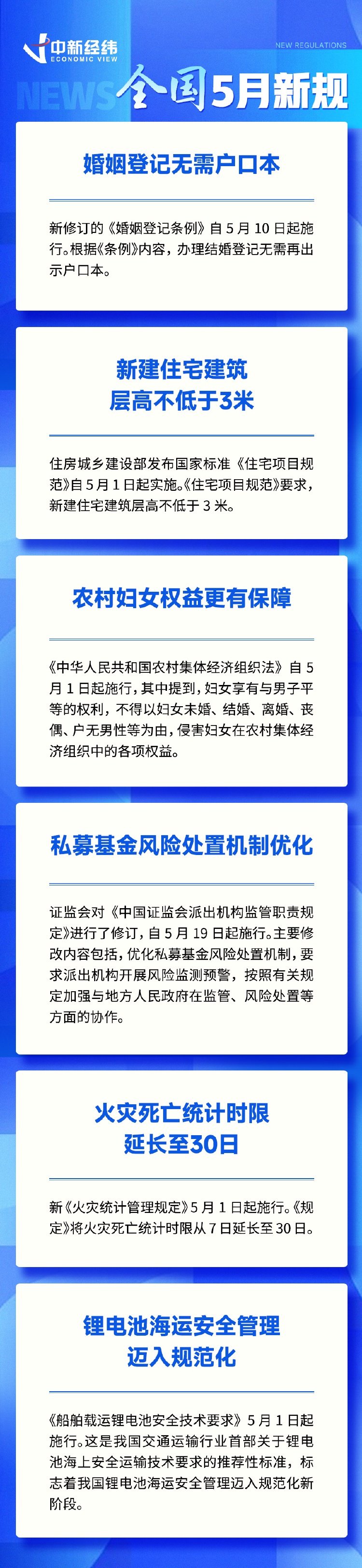 中新经纬消息,即将步入5月,一批新规将落地,涉及婚姻登记、住宅、生育津贴等,哪一项你最关心?
