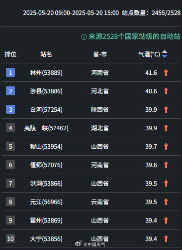 具体来看,19日,河南多地最高气温超过了40℃,气温最高的林州达到了43.2℃,并打破全省5月最高气温纪录。今天白天,河南仍有大范围高温天气,高温强度略有减弱,截至16时,林州最高气温为41.6℃,占据全国气温排行榜首位。20日,山西高温持续,截至15时,稷山、洪洞、霍州等地最高气温已达39℃以上。