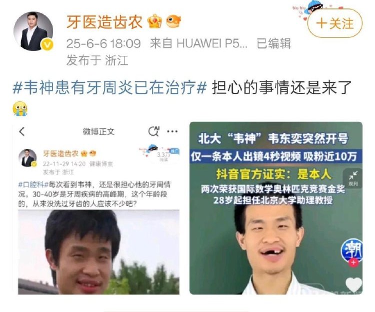 据媒体报道,早在2022年11月,一位名叫牙医造齿农的医学博主就发帖称,“每次看到韦神,还是很担心他的牙周情况。30-40岁是牙周疾病的高峰期,这个年龄段的,从来没洗过牙齿的人应该不少吧?”贴文当中,牙医造齿农附上韦东奕接受采访时的视频截图。