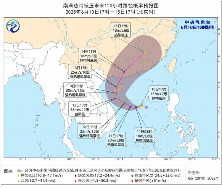 根据最新预报,台风生成后将逐渐向海南岛南部到广东西部一带沿海靠近,并将于13日前后在上述沿海登陆,登陆时强度或为强热带风暴级到台风级。