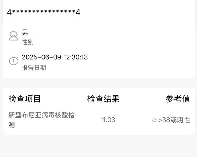 记者在该名网友提供的医院检查报告看到,6月9日,老人新型布尼亚病毒核酸检测结果数值为11.03,呈阳性,“正常值要大于38,医院说数值越小毒性越强。治疗几天没有好转,所以在网上发帖求助。6月10日,老人去世,离被蜱虫咬只有一周时间。”