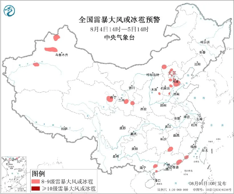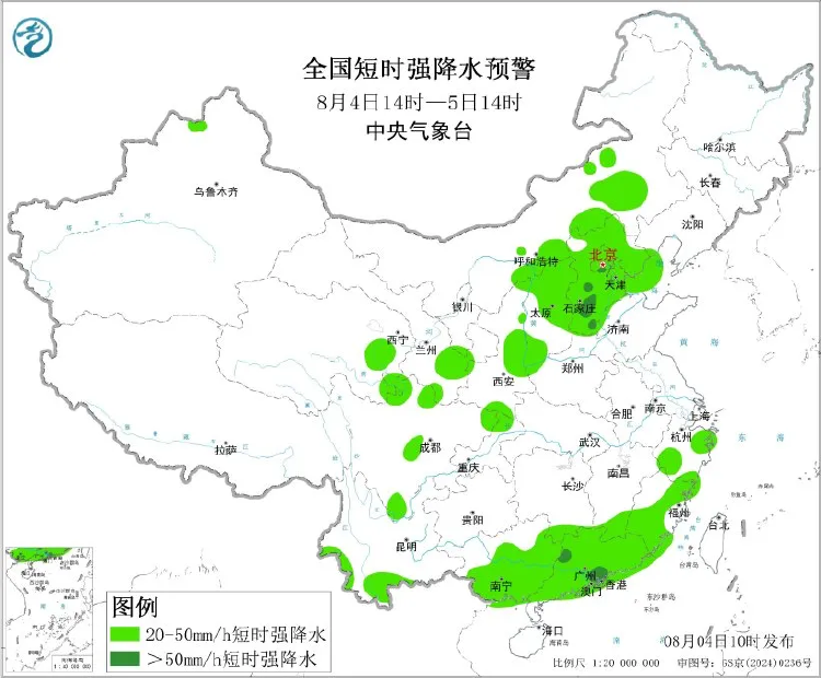 中央气象台8月4日10时继续发布强对流天气蓝色预警:预计8月4日14时至5日14时,西北地区中东部、华北中北部、华南南部等地的部分地区将有8级以上雷暴大风或冰雹天气;西北地区中东部、华北、江南南部和东部、华南中东部等地的部分地区将有小时雨量大于20毫米的短时强降水天气,其中,河北中南部、北京西南部、广东西部和中南部等地的部分地区小时雨量大于50毫米,最大可达80毫米以上。
