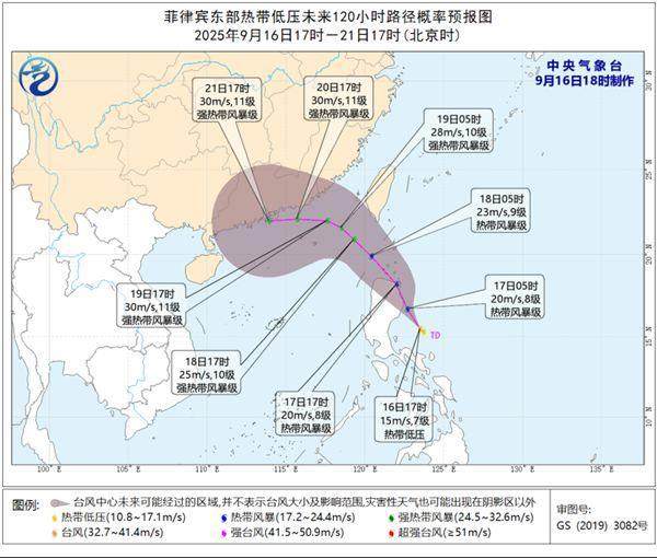 预计,热带低压将以每小时15公里左右的速度向北偏西方向移动,强度逐渐增强,将于16日夜间到17日加强为今年第17号台风,17日白天登陆或擦过菲律宾吕宋岛东北部,17日夜间到18日上午穿过巴士海峡移入南海东北部海面,以后趋向我国台湾到广东一带沿海。