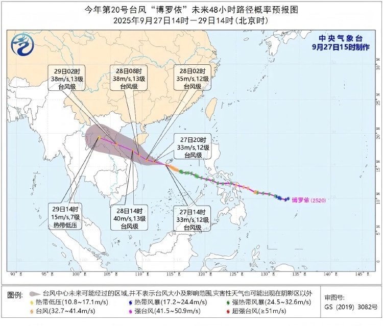 大风预报:27日至29日,南海大部、巴士海峡、广东中西部沿海、海南岛、广西沿海、北部湾北部、琼州海峡将有6~8级、阵风9级的大风,其中,南海中部和西北部海域、北部湾南部的风力有9~10级、阵风11~12级,台风中心经过的附近海域或地区风力可达11~13级、阵风14~15级。