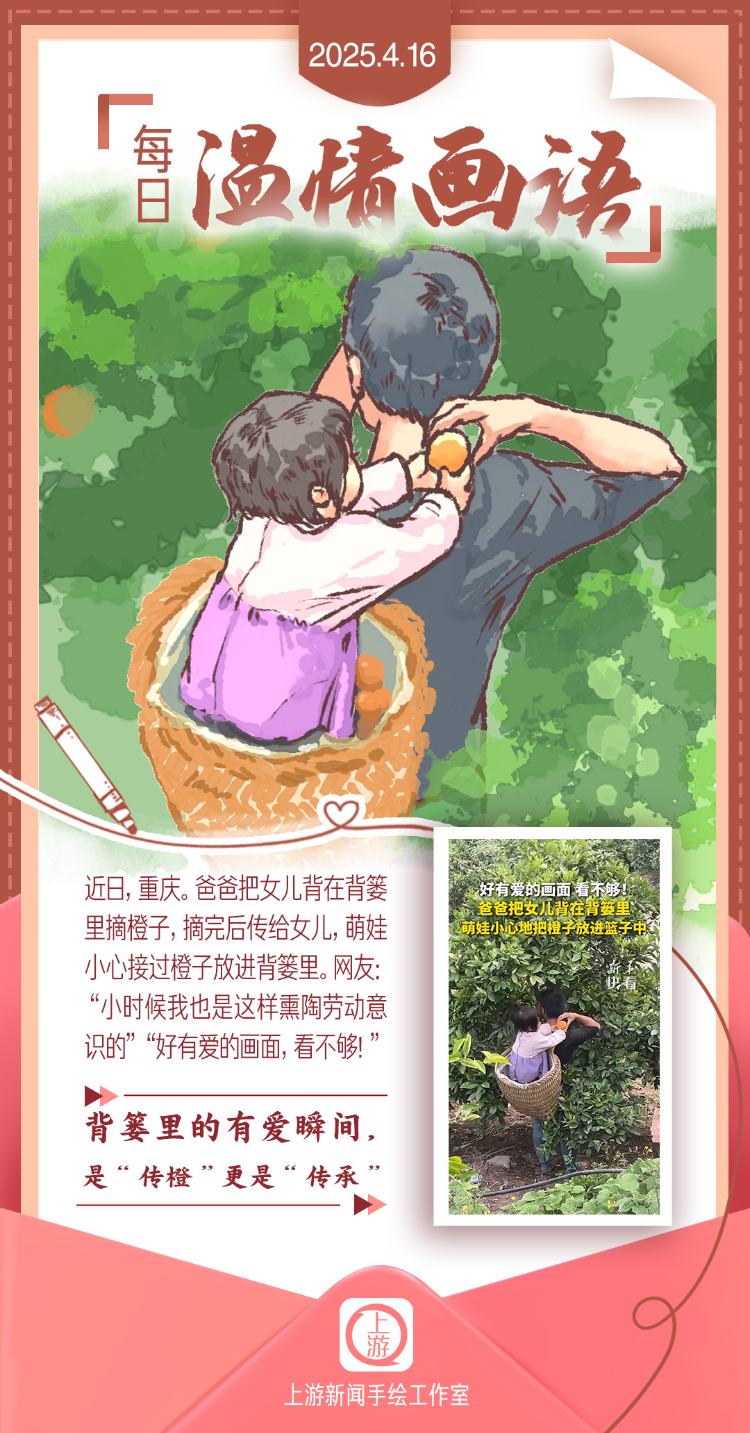近日,重庆。爸爸把女儿背在背篓里摘橙子,摘完后传给女儿,萌娃小心接过橙子放进背篓里。网友:“小时候我也是这样熏陶劳动意识的”“好有爱的画面,看不够!”