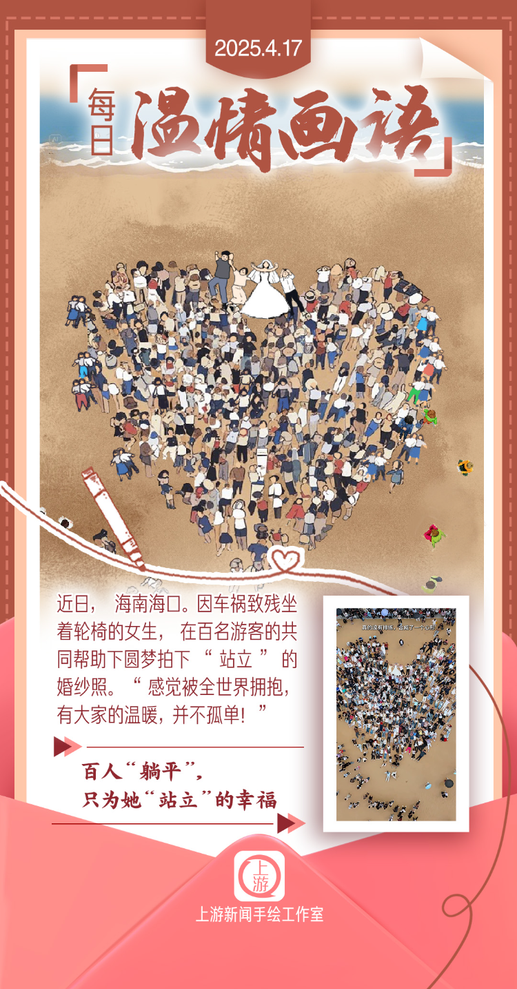 近日,海南海口。因车祸致残坐着轮椅的女生,在百名游客的共同帮助下圆梦拍下“站立”的婚纱照。“感觉被全世界拥抱,有大家的温暖,并不孤单!”