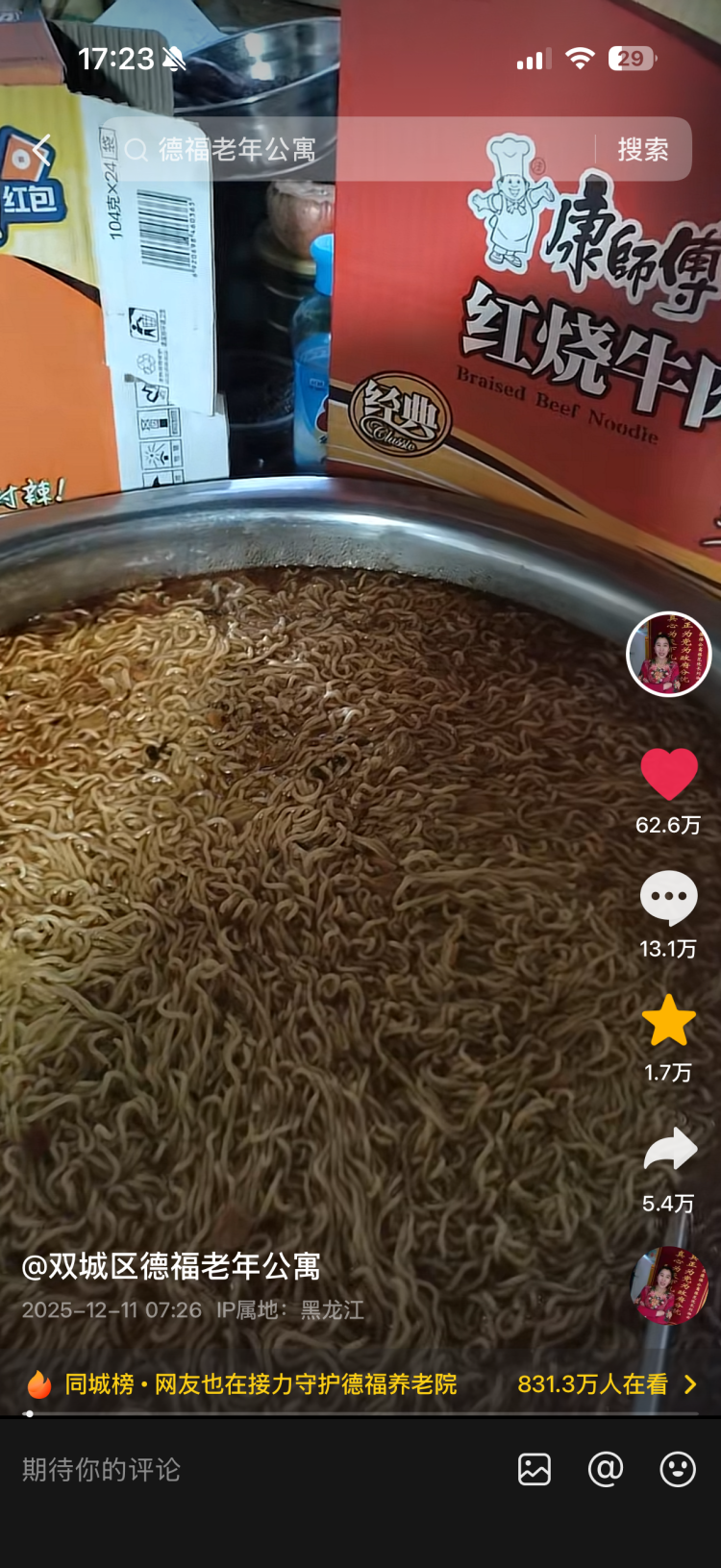 12月11日,位于黑龙江省哈尔滨市双城区的德福老年公寓院长刘湘云在短视频平台发布了一条给老人煮方便面的日常视频。视频中,她一边忙活一边说明,方便面是呼兰爱心人士捐赠的,拍摄发布只为让大家知道,捐赠的物资真正送到了老人手中。起初视频下有不明情况的网友留言“给老人吃方便面,根本没营养。”随后有本地网友解释:这是一家接纳特殊老人的收容所,收留孤寡老人、残障人士,平时院长还得掏自己钱给老人买菜。