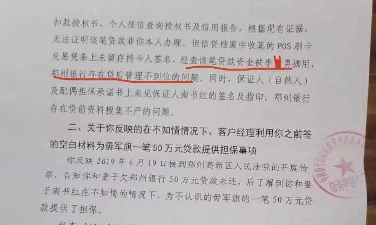 该《调查意见书》还提到,以徐世海名义办理的另一笔贷款中,“信贷档案中收集的POS刷卡、交易凭条上未留存持卡人签名,经查该笔贷款资金被李某勇挪用,郑州银行存在贷后管理不到位的问题。”