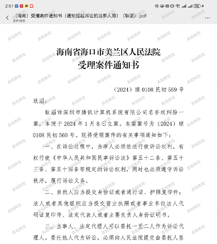 美兰区人民法院的受案通知书显示,耿滔诉腾讯公司名誉权纠纷一案,该院已在2024年1月8日立案。