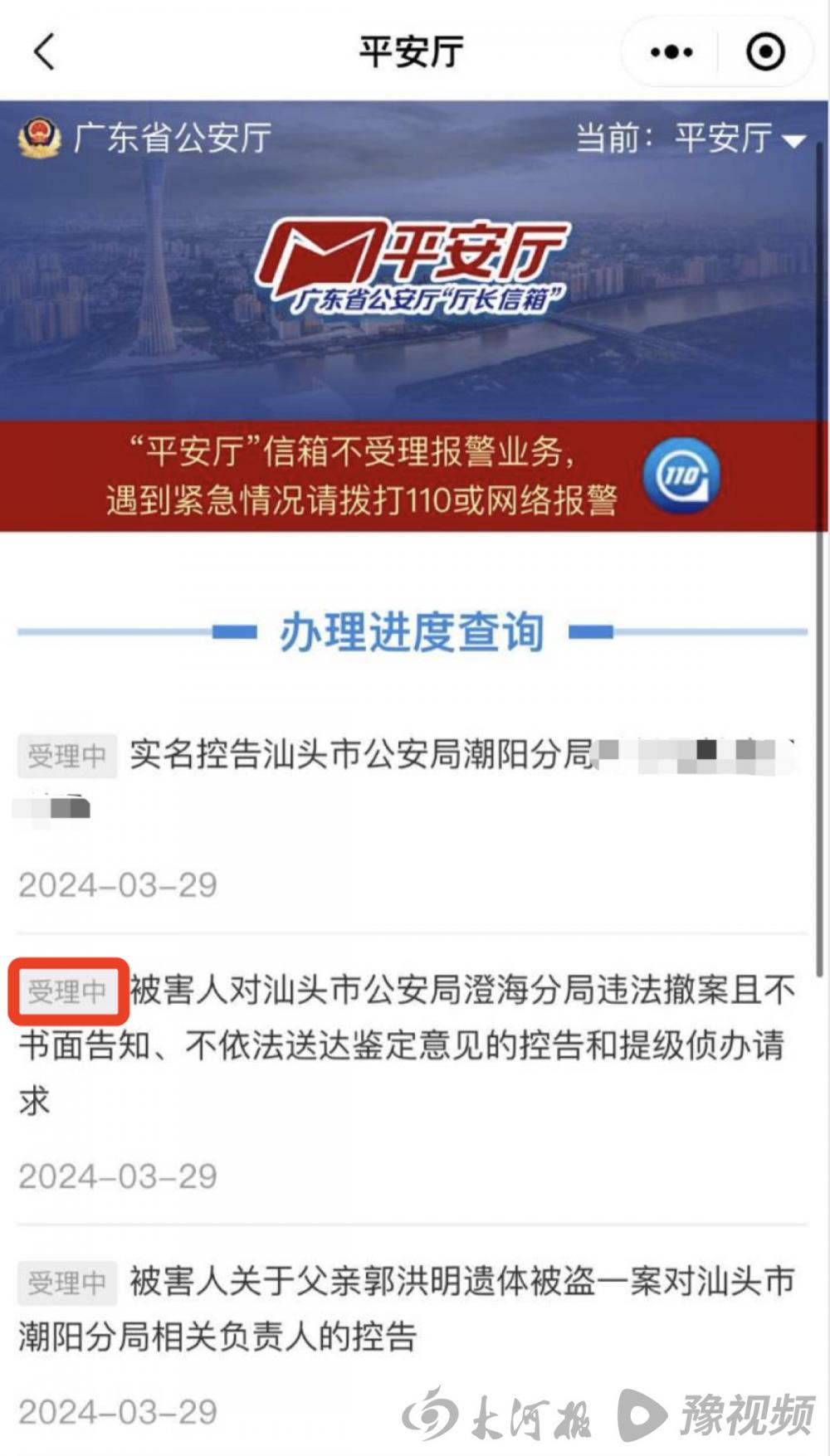 2023年10月,郭武斌在广东省公安厅“平安厅”网上投诉“澄海分局不依法送达书面撤案决定书”,该投诉至今还在受理中。