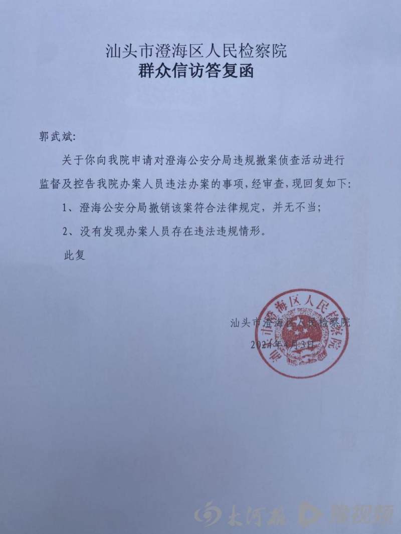 2024年4月3日,汕头市澄海区检察院在回复郭武斌的“信访答复函”中提到,澄海公安分局撤销该案符合法律规定,并无不当;没有发现办案人员存在违法违规情形。
