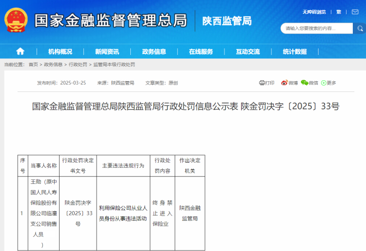 今年3月25日,国家金融监督管理总局陕西监管局对原中国人民人寿保险股份有限公司临潼支公司销售人员王勋作出终身禁止进入保险业的行政处罚。