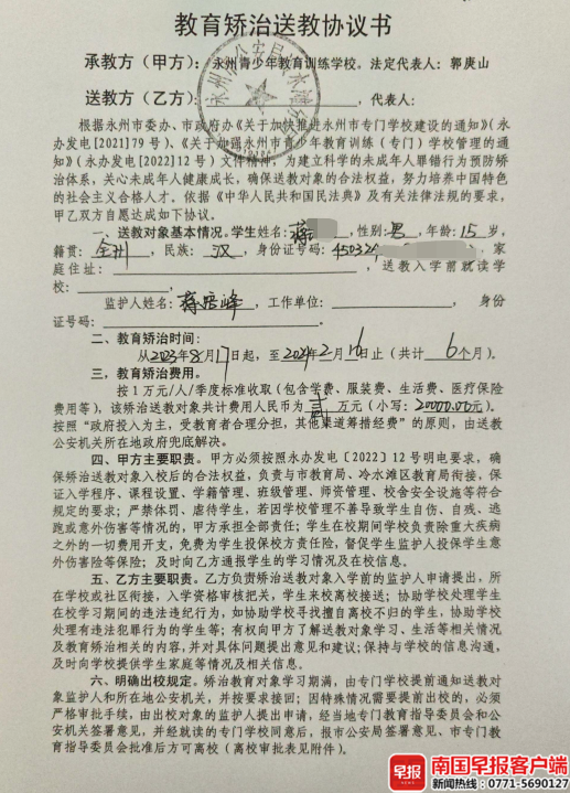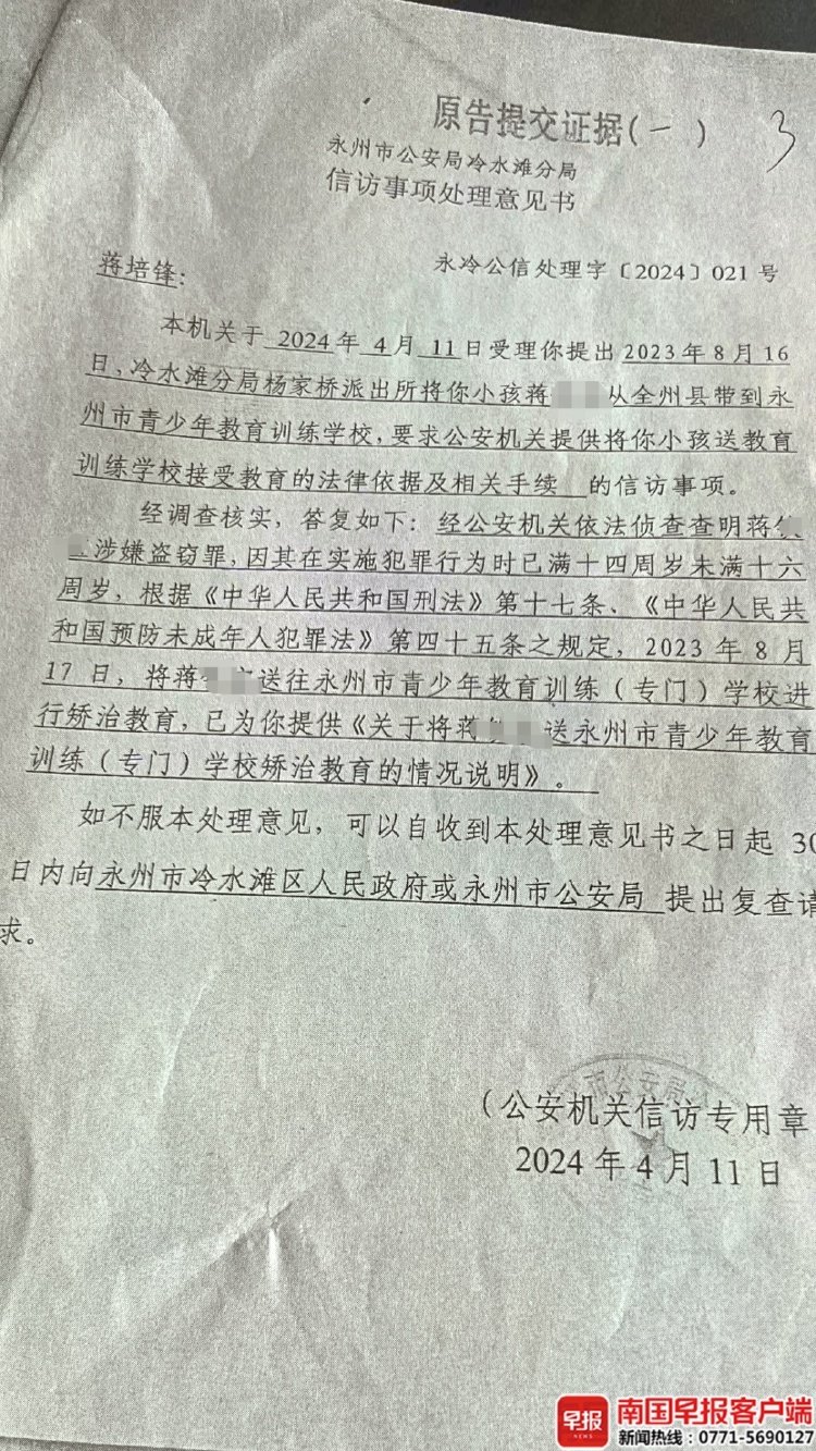 蒋培锋说,事后他得知,阿军与阿博在永州市冷水滩区一小区地下停车场盗窃车内现金3500元,涉嫌盗窃罪被永州市公安局冷水滩分局抓捕带走,因未满16周岁而不予刑事处罚,2023年8月17日被对方送往永青学校进行专门矫治教育。