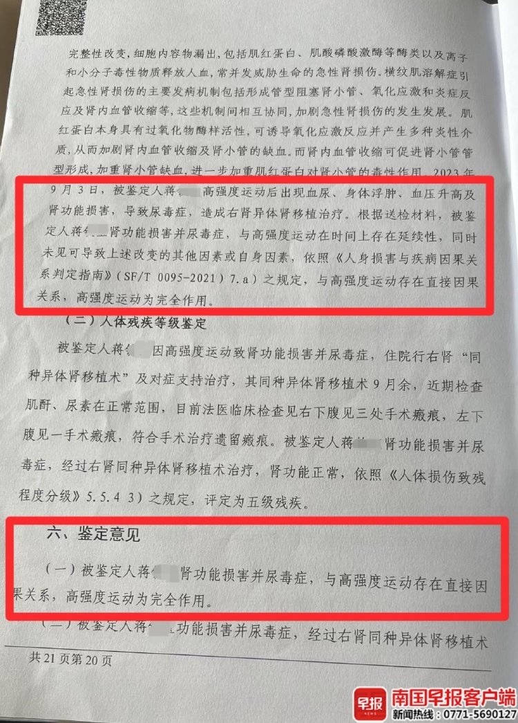 “法院先后委托3家鉴定机构,对孩子的肾功能损害并尿毒症与高强度运动是否存在因果关系进行鉴定,法院反馈3家机构都无法鉴定。”蒋培锋说,今年3月,他委托桂林医学院附属医院司法鉴定中心,对阿军的人体残疾等级(含伤病关系)进行鉴定。司法鉴定意见书显示:阿军肾功能损害并尿毒症,与高强度运动存在因果关系,高强度运动为完全作用;阿军肾功能损害并尿毒症,经过右肾同种一体肾移植术治疗,评定为五级残疾。