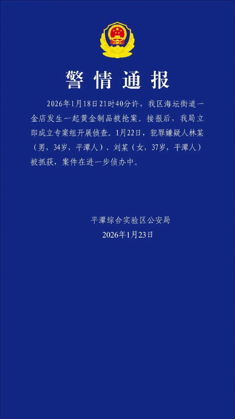 2026年1月18日21时40分许,我区海坛街道一金店发生一起黄金制品被抢案。接报后,我局立即成立专案组开展侦查。1月22日,犯罪嫌疑人林某(男,34岁,平潭人)、刘某(女,37岁,平潭人)被抓获,案件在进一步侦办中。
