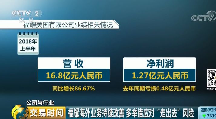 福耀玻璃工业集团股份有限公司董事长 曹德旺:在今年的形势下能够做到这样的业绩出来,我自己感到很满意。因为今年很多企业很难受,我们主要是靠新技术还有我们用户的共同努力,来实现我们的目标。今年中报比去年好,主要受益于海外投资,今年产生利润,去年是亏损。