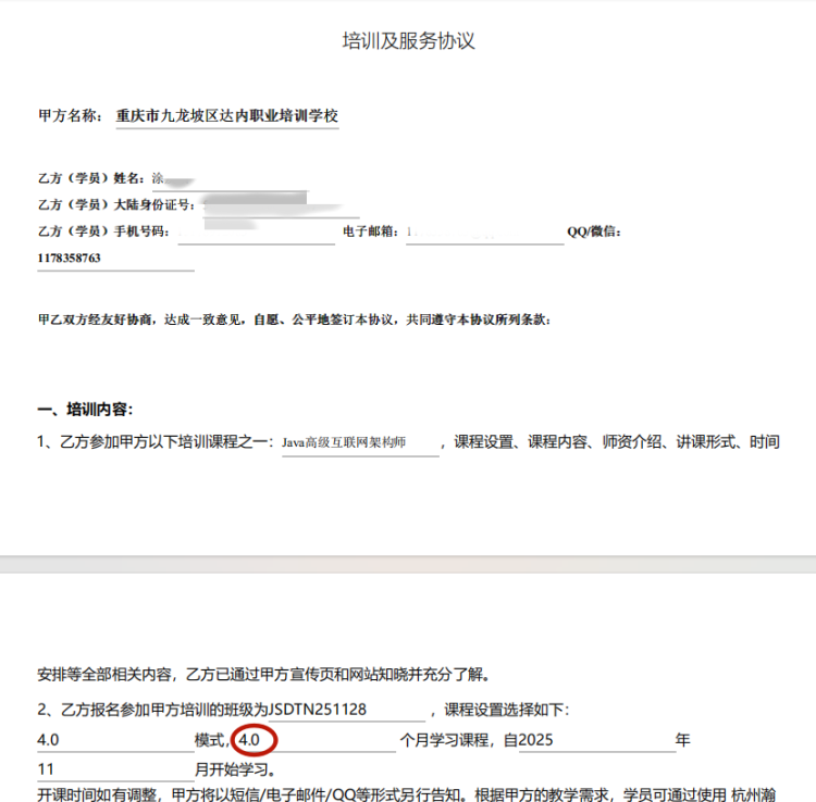 涂先生与学校签订的合同截图,显示培训时间为4个月,开始学习时间为2025年11月。(采访对象供图)