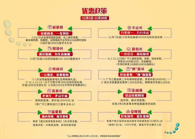 即日起,仅需14.5万即可全包闪购欧蓝德,电商平台专供100台限时抢购。11月7日或14日到店还有机会抽取49999元购车抵扣券和200-5000面额油卡。11月1日至11日期间,订购欧蓝德、奕歌、劲炫车型,享受交1000抵2000"翻倍礼";电商平台下订车型还可享受1000元购车抵扣券、价值1888元文创礼包等惊喜好礼。此外还有多重换购补贴、多项金融服务等丰富福利,更多优惠详情请咨询当地经销店。