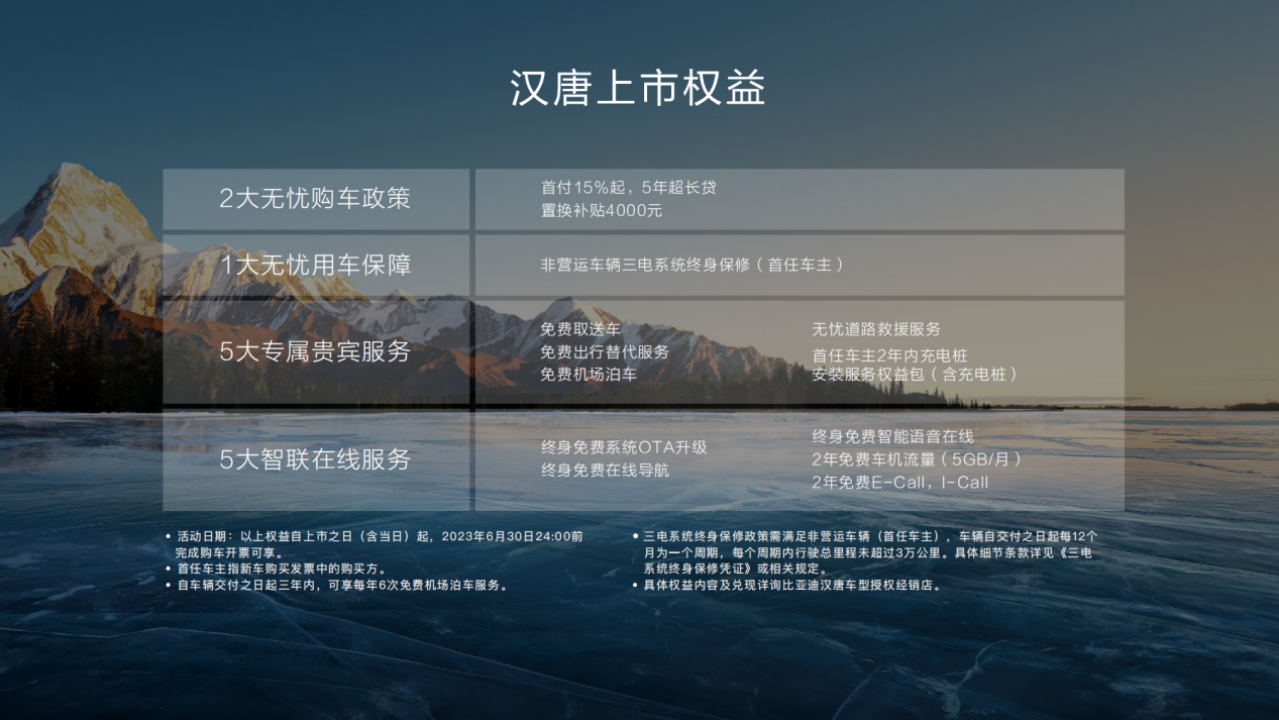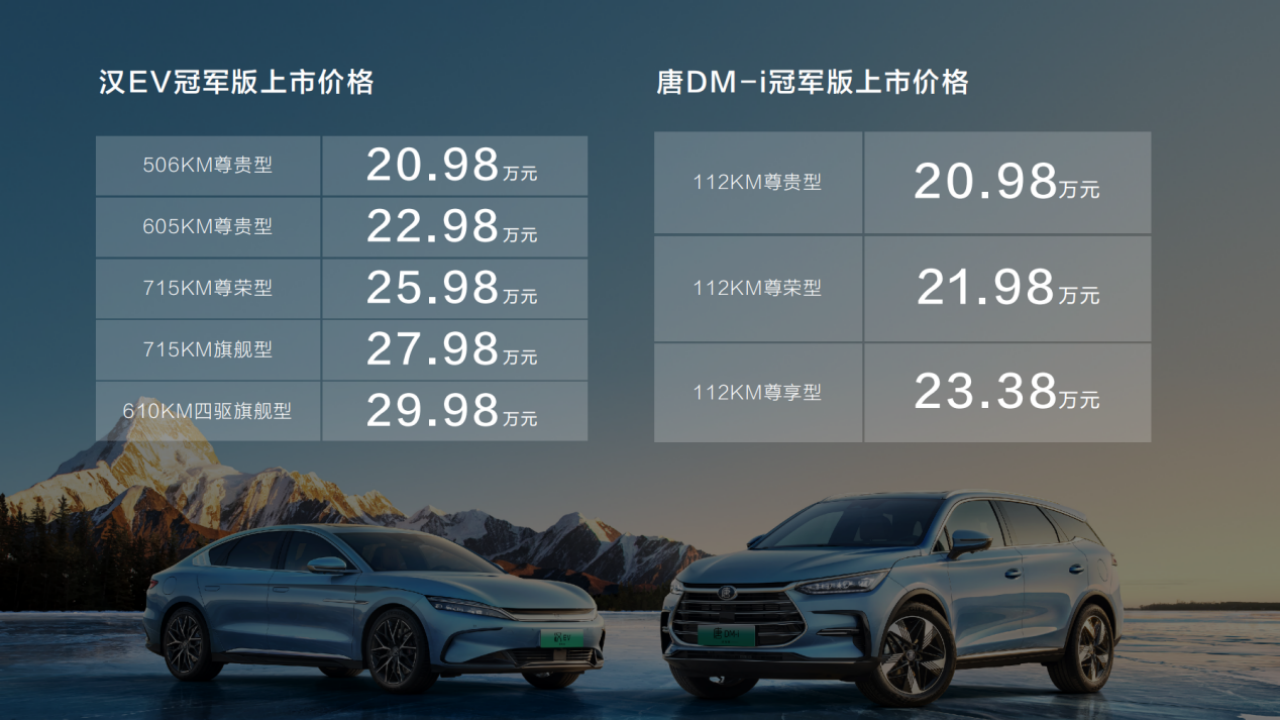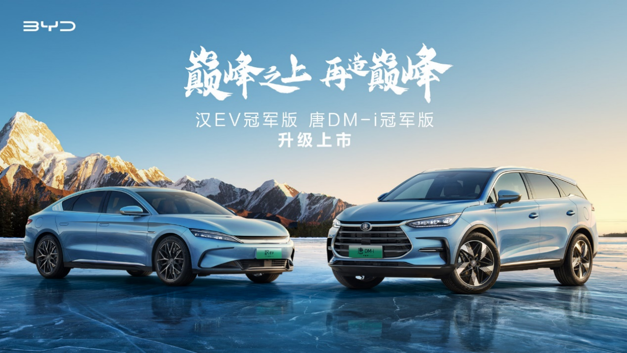 其中,汉EV冠军版建议零售价为20.98万~29.98万元,唐DM-i冠军版建议零售价为20.98万~23.38万元,同时两款车型为用户准备了2大无忧购车政策、1大无忧用车保障、5大专属贵宾服务、5大智联在线服务等多重购车礼遇。