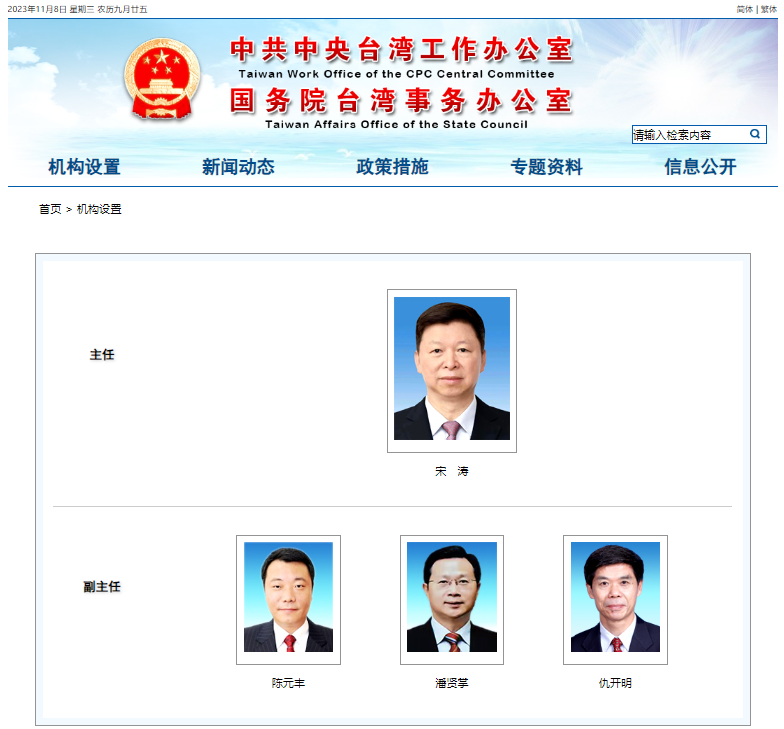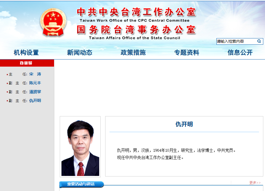 据中共中央台湾工作办公室官网消息,“机构设置”栏目更新显示,仇开明已任中共中央台办副主任。