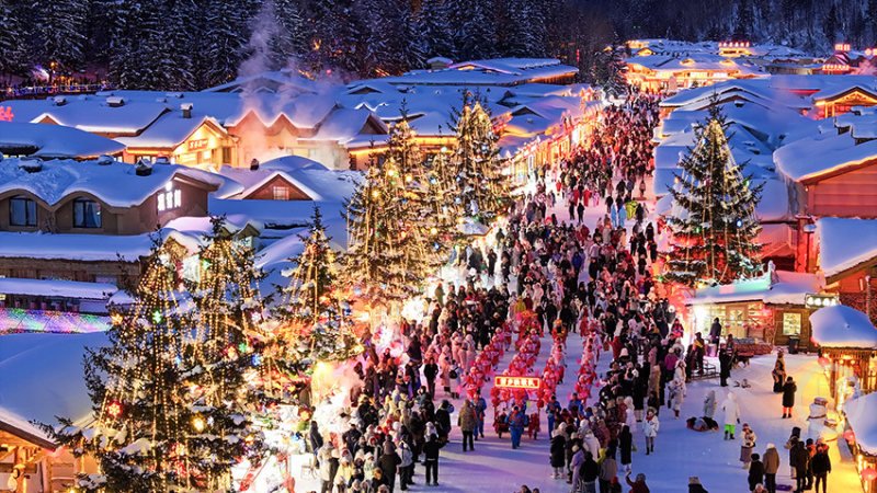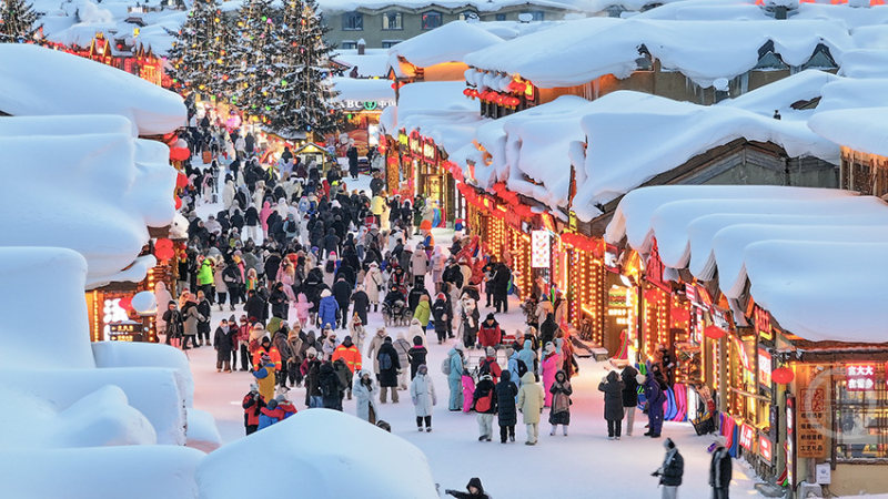 1月17日,黑龙江省海林市“中国雪乡”景区银装素裹,屋檐冰凌倒挂,红灯笼点缀其间,宛如童话世界。游客漫步雪韵大街,赏雪、拍照、游玩,尽享北国冬日的独特乐趣。