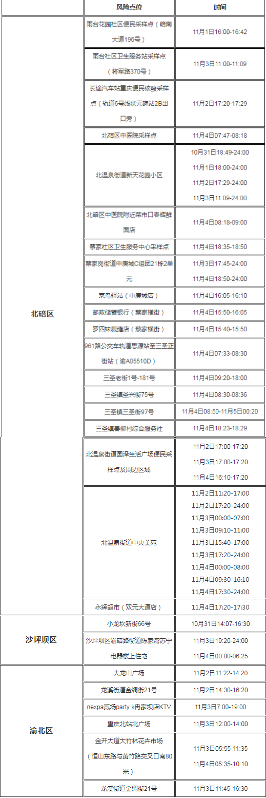 2022年11月6日,北碚区新增报告2例确诊病例(确诊病例1、2)和2例无症状感染者(无症状感染者3、4)。现将在渝主要活动轨迹的风险点位和时间通告如下:
