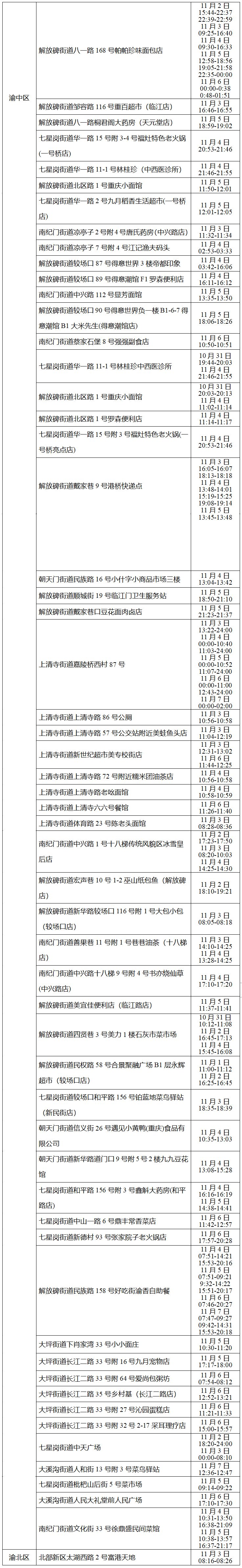 2022年11月8日,渝中区新增报告29例无症状感染者(无症状感染者6-34)。现将在渝主要活动轨迹的风险点位和时间通告如下: