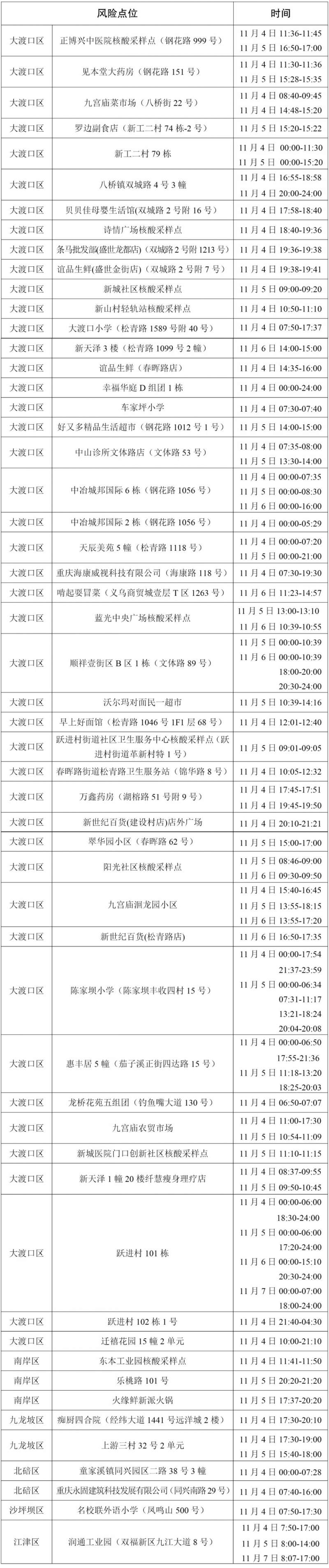 2022年11月8日,大渡口区新增报告7例确诊病例(确诊病例5-11)和28例无症状感染者(无症状感染者19-46)。现将在渝主要活动轨迹的风险点位和时间通告如下: