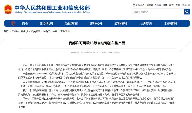12月15日,工业和信息化部正式附条件批准两家汽车企业提交的搭载L3级有条件自动驾驶功能的智能网联汽车产品准入申请。其中长安申报的深蓝SL03(专业代号SC7000AAARBEV)便是其中之一。作为全国仅有的两个首批试点城市之一,重庆获得首批试点资格。