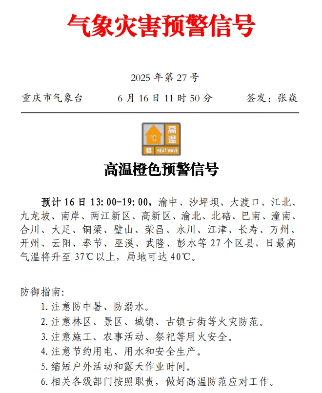 6月16日中午,重庆市气象台发布高温橙色预警信号。预计6月16日13:00-19:00,渝中、沙坪坝、大渡口、江北、九龙坡、南岸、两江新区、高新区、渝北、北碚、巴南、潼南、合川、大足、铜梁、璧山、荣昌、永川、江津、长寿、万州、开州、云阳、奉节、巫溪、武隆、彭水等27个区县,日最高气温将升至37℃以上,局地可达40℃。
